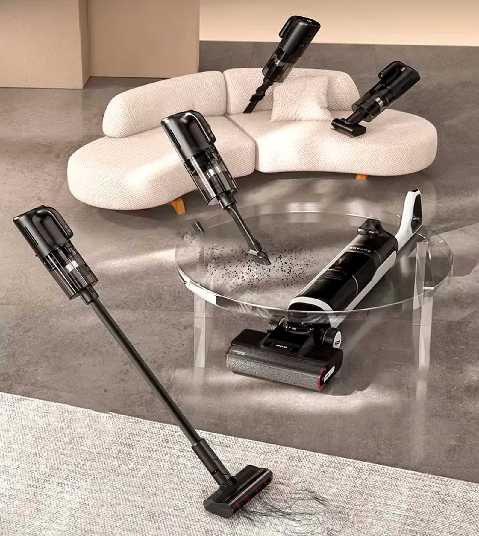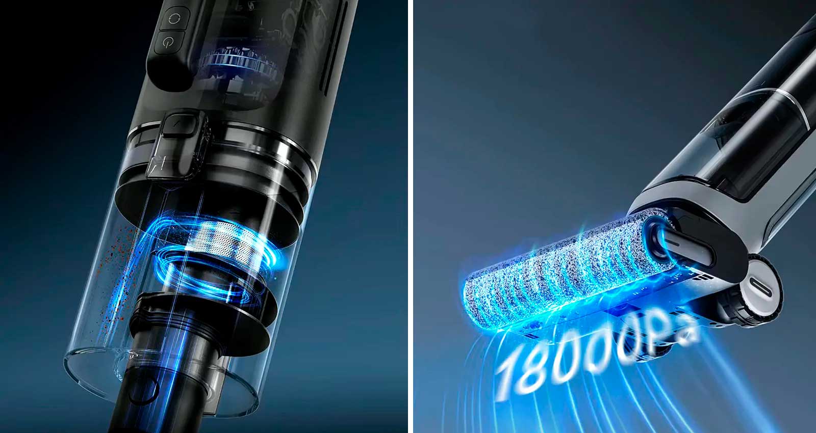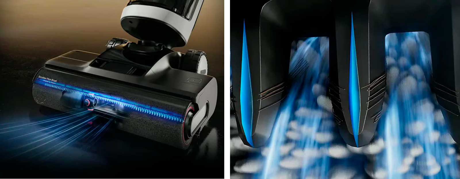 Пылесос оснащён мотором на 4400 об/мин и создаёт мощность всасывания до 18,000 Па. Компактный и тонкий корпус (14 см) позволяет убирать даже под мебелью. Система AI-сервоприводов облегчает управление, снижая физическую нагрузку.