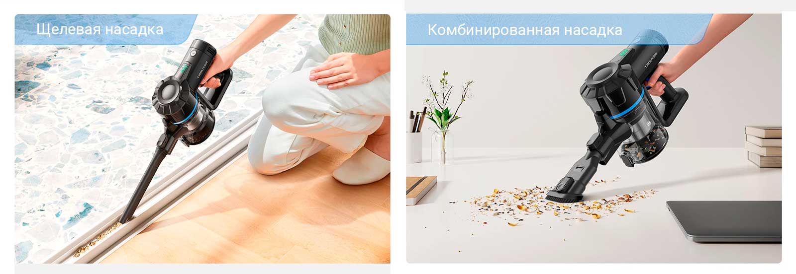 Набор насадок позволяет убирать любые покрытия и зоны. Щелевая насадка очищает углы и щели, а комбинированная щетка эффективно убирает рабочие столы, окна и двери.