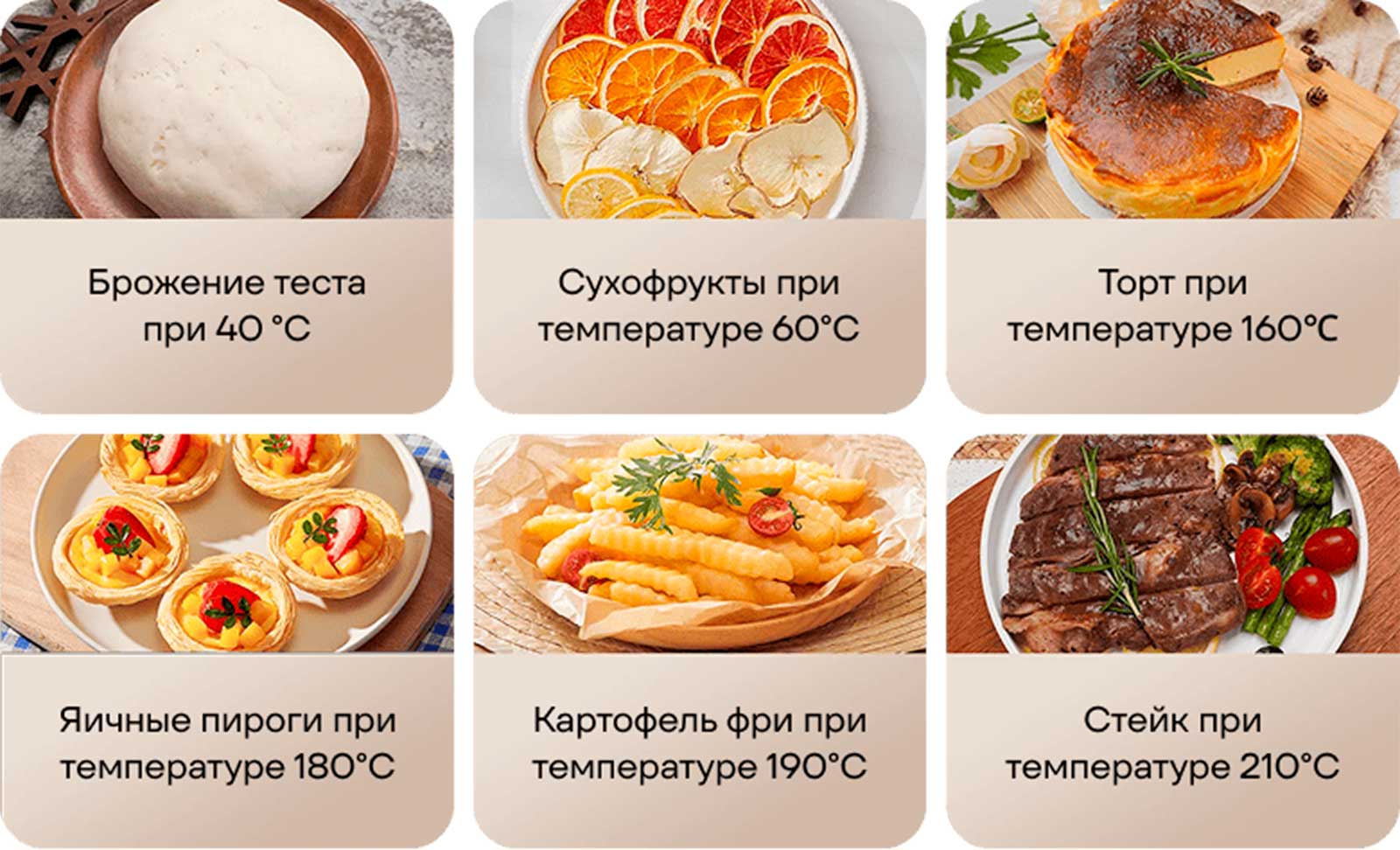 Универсальность гаджета - одно из его главных преимуществ. Благодаря широкому диапазону регулировки температуры от 40 °C до 210 °C он подходит для выполнения самых разных кулинарных задач. Этот диапазон позволяет аккуратно сушить
