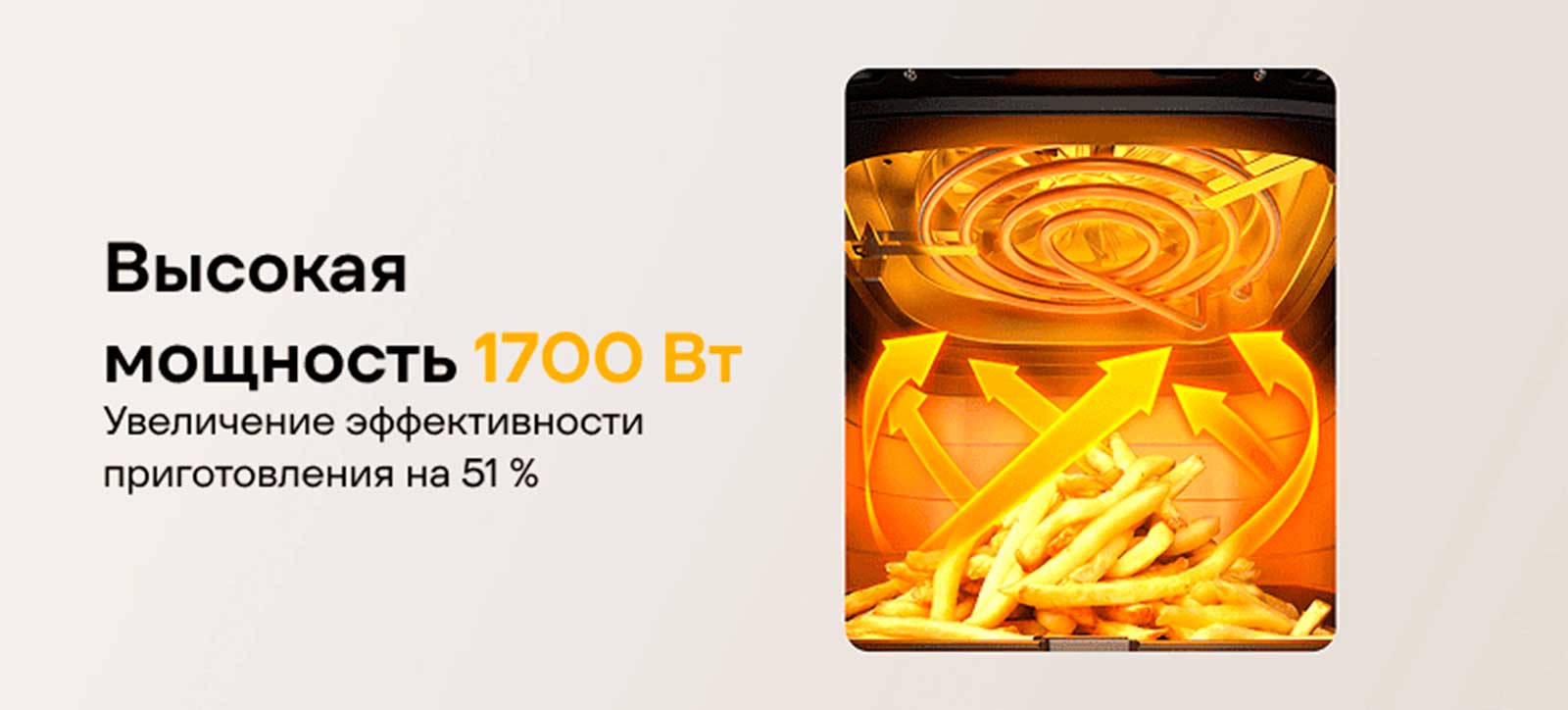 Xiaomi Air Fryer 6.5L оснащен нагревательным элементом мощностью 1700 Вт, этот прибор привносит серьезную мощность на вашу кухонную столешницу. Высокая мощность напрямую влияет на скорость и эффективность. Он может похвастаться
