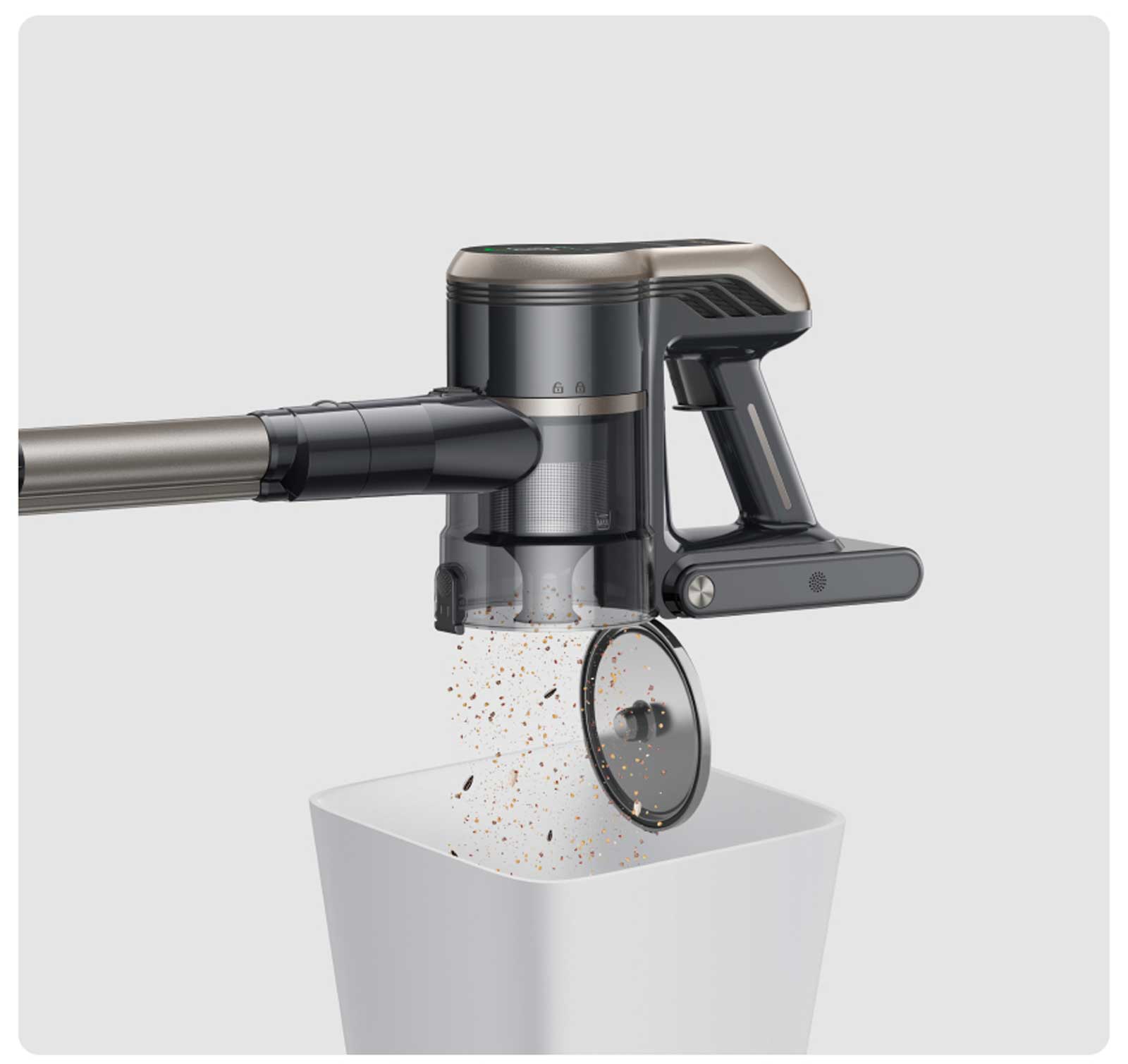 Чтобы опустошить контейнер для пыли, достаточно одного нажатия. Контейнер для пыли и фильтр можно снимать с пылесоса и промывать по отдельности.