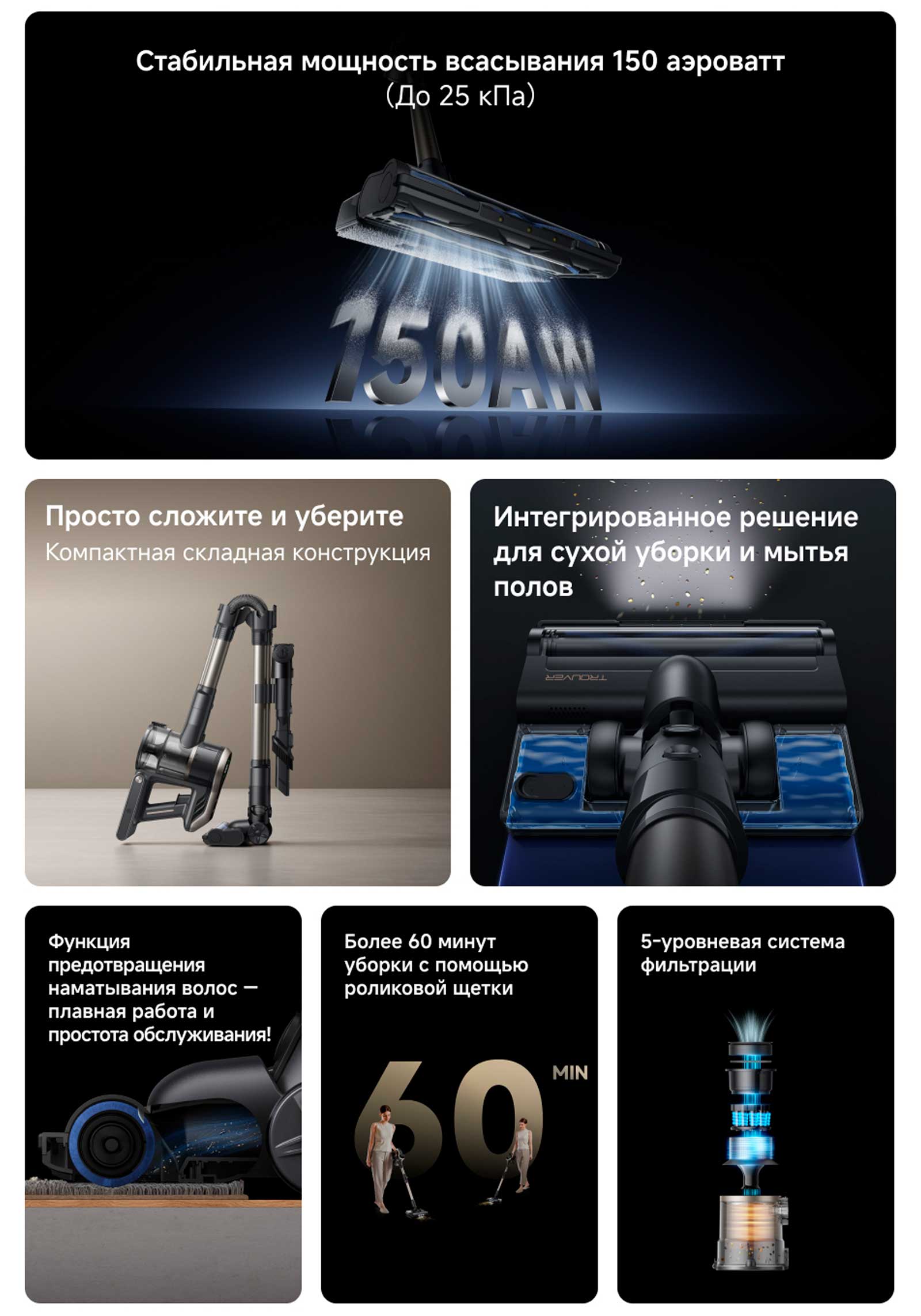 Испытайте стабильную и поистине потрясающую мощность всасывания 150 аэроватт! Благодаря 4-уровневой системе фильтрации с дополнительным уровнем, реализованным с помощью 10-конусной циклонной технологии разделения пыли и воздуха,