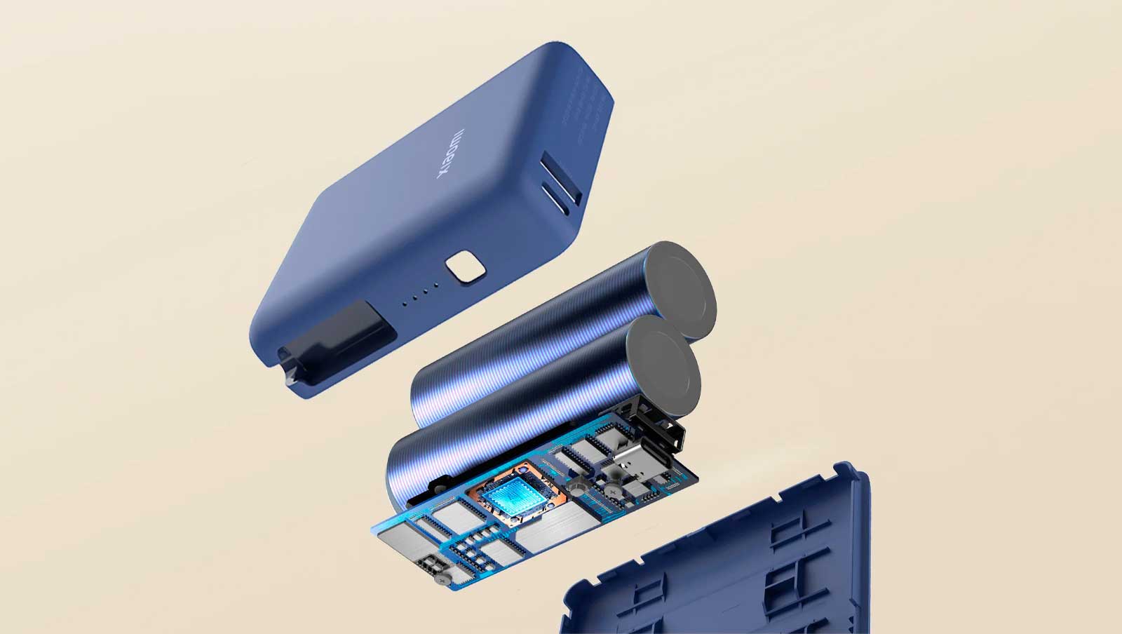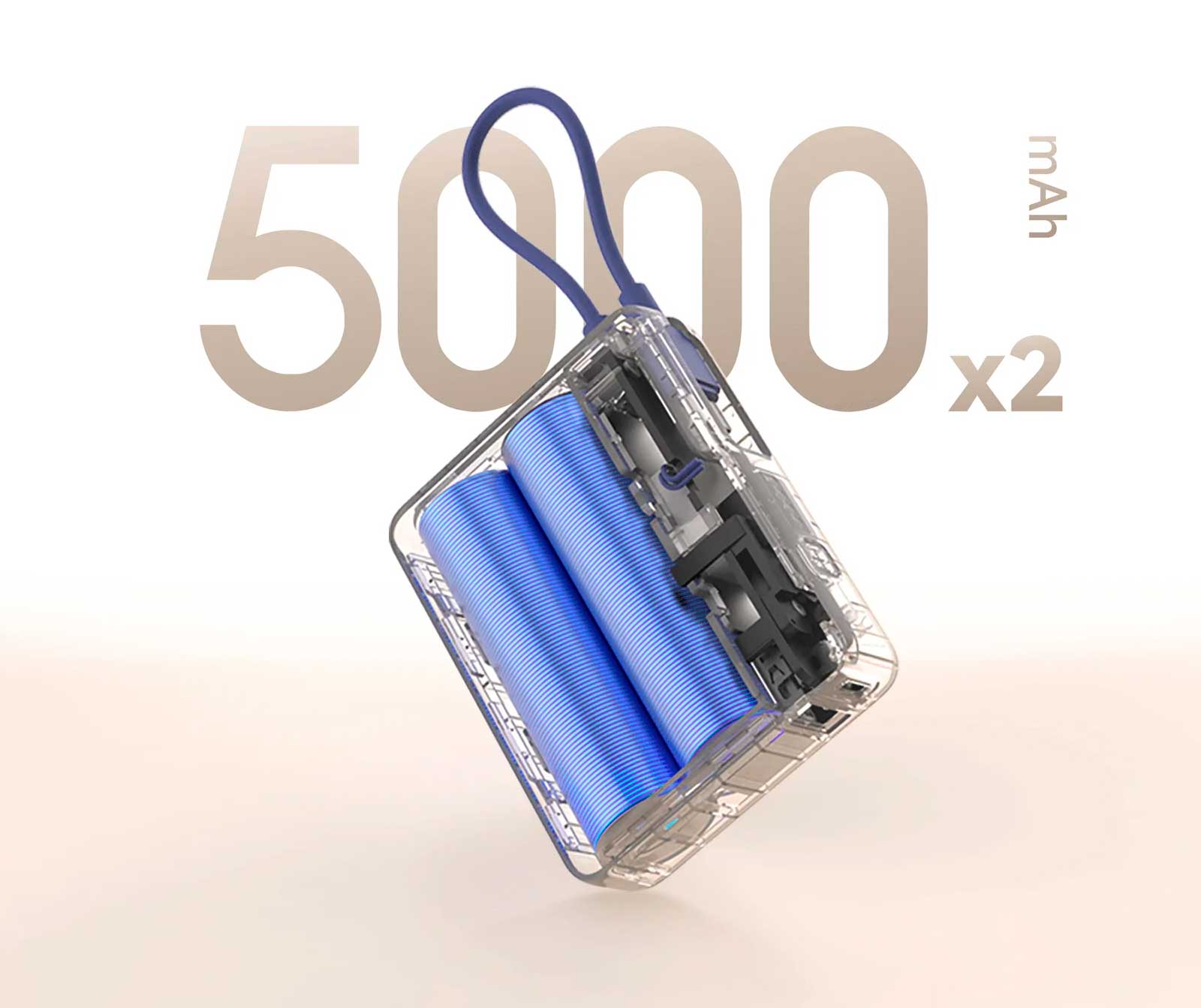 Пауэрбанк оснащён двумя высококачественными батарейными элементами мощностью 5000 мА·ч, что эквивалентно питанию батареи на 10 000 мАч. Встроенный умный идентификационный чип может автоматически сопоставлять выходной ток с рабочим