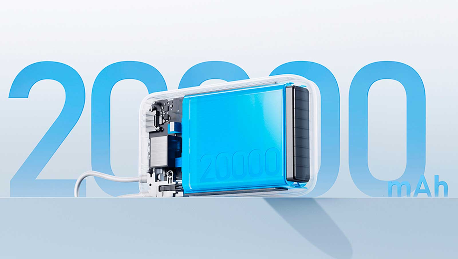 Внешний аккумулятор Xiaomi Power Bank 20 000 оснащён двумя высокоёмкими батареями по 10 000 мАч, что обеспечивает суммарную энергоёмкость 74 Вт·ч и номинальную ёмкость 13 000 мАч при напряжении 5 В — этого достаточно для нескольких