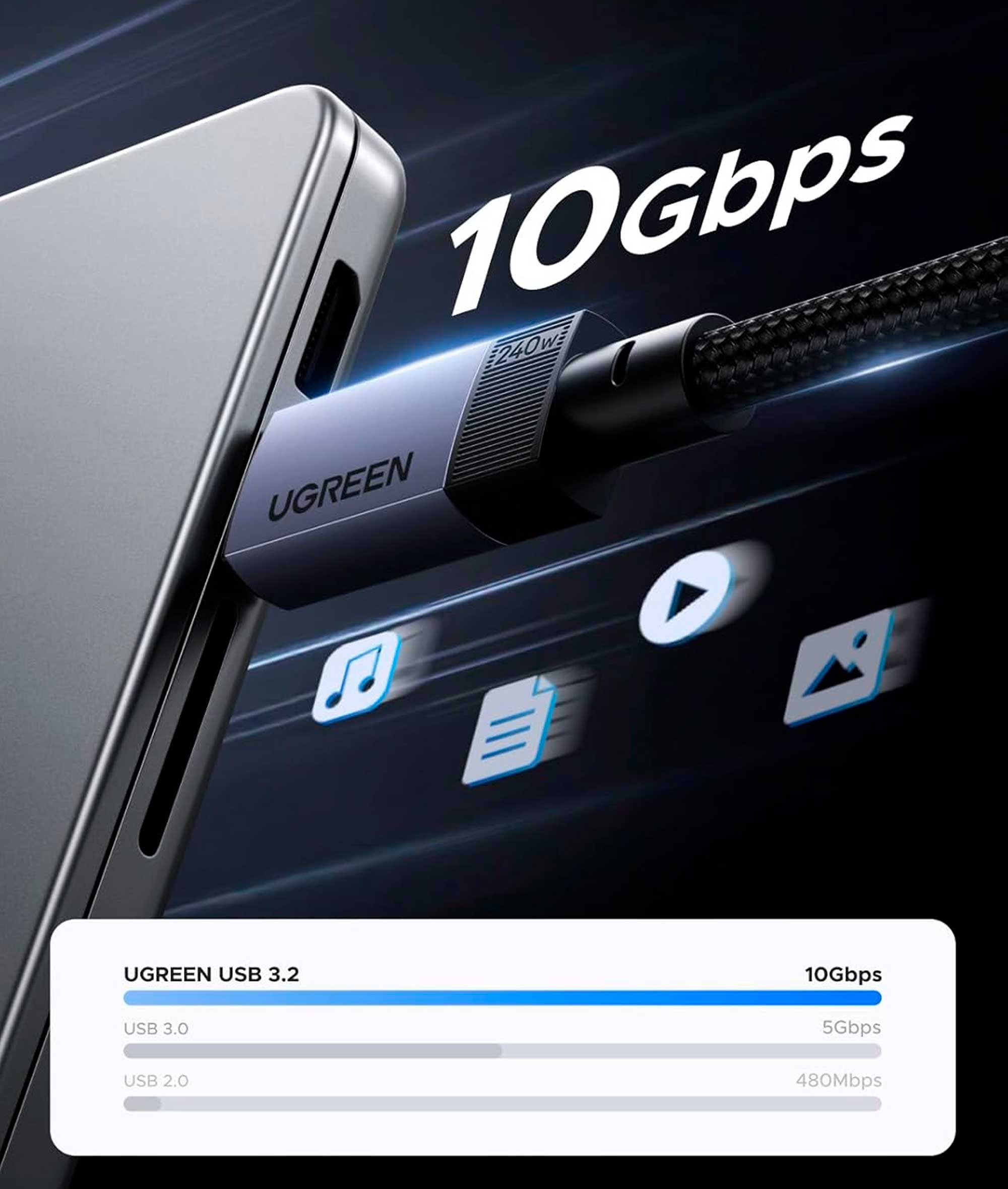 Зарядный кабель USB-C соответствует стандарту USB 3.2 Gen 2, обеспечивая скорость передачи данных до 10 Гбит/с. Это позволяет передать HD-фильм всего за 2,5 секунды, что идеально для работы с большими файлами, например, при переносе