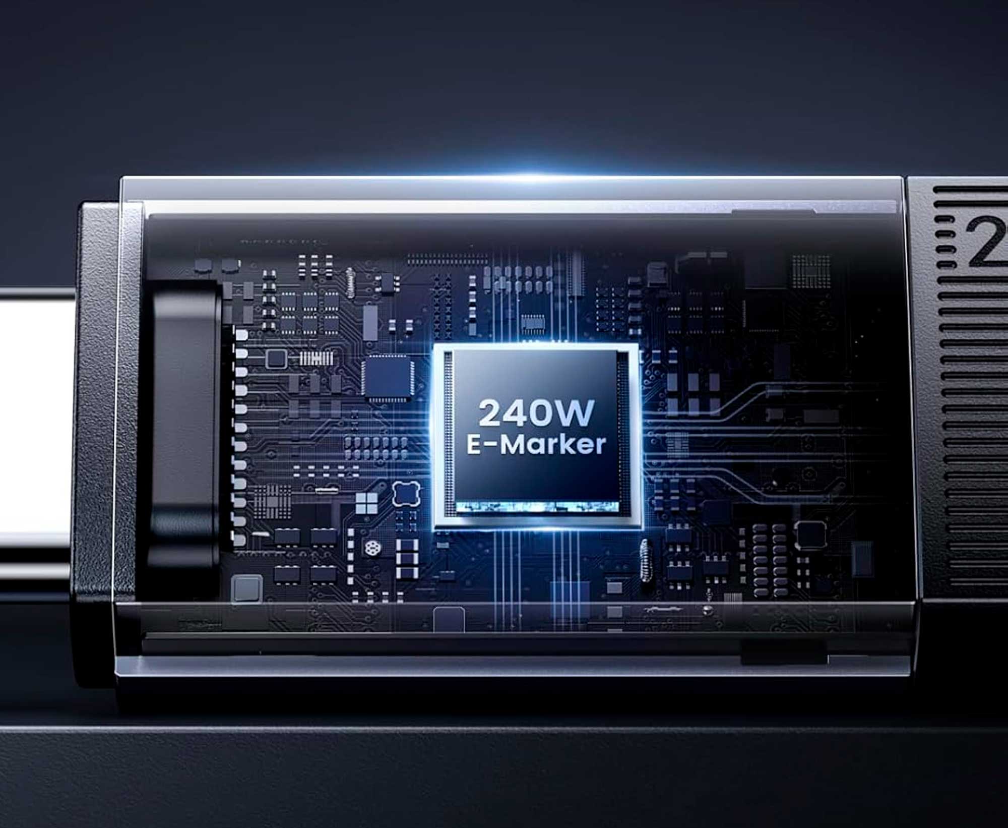 Оснащен эксклюзивным E-Marker чипом, который интеллектуально подбирает необходимый ток, а резисторы на 56KΩ обеспечивают стабильную проводимость и плавную зарядку, защищая ваше устройство от потенциальных повреждений. Прочный и