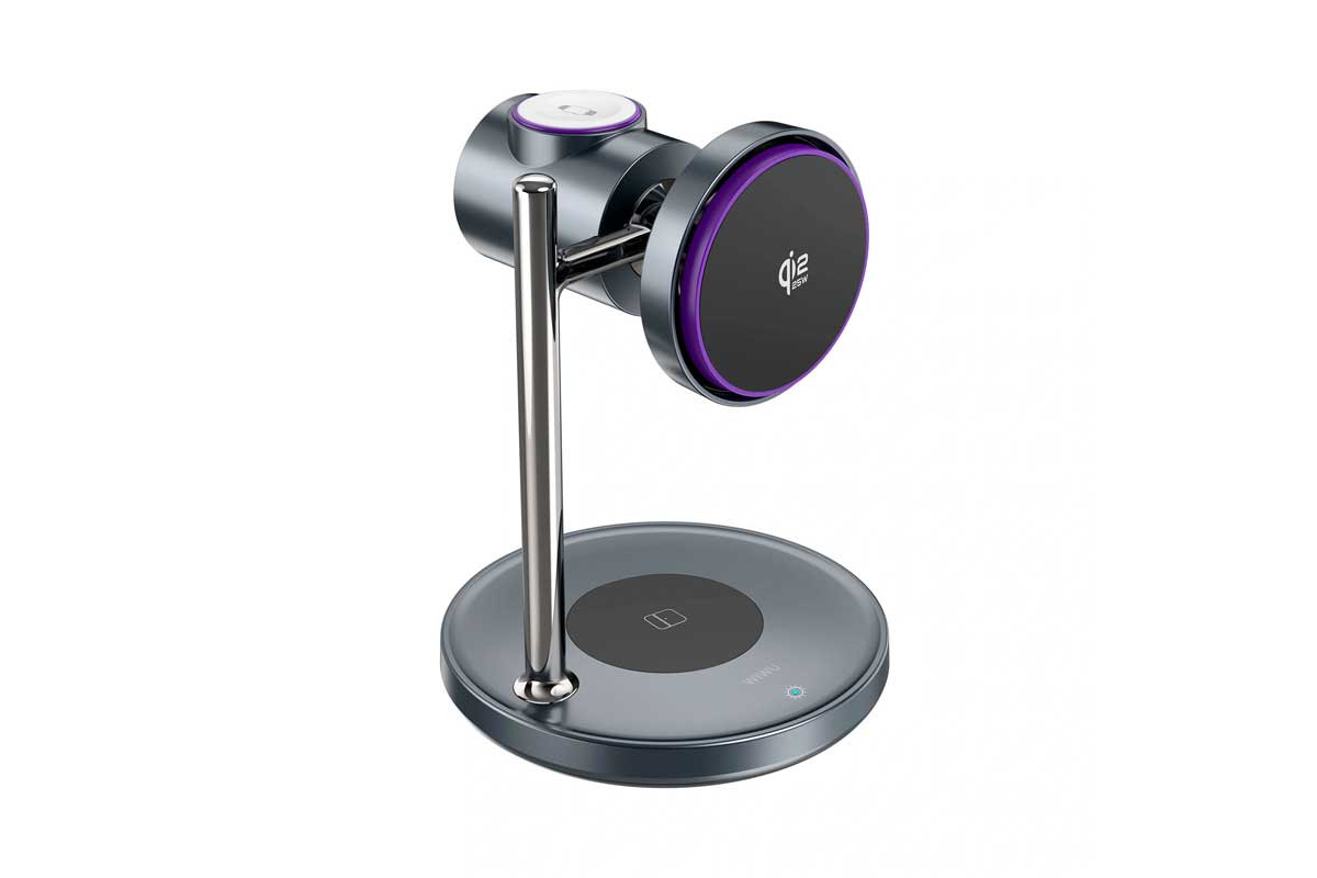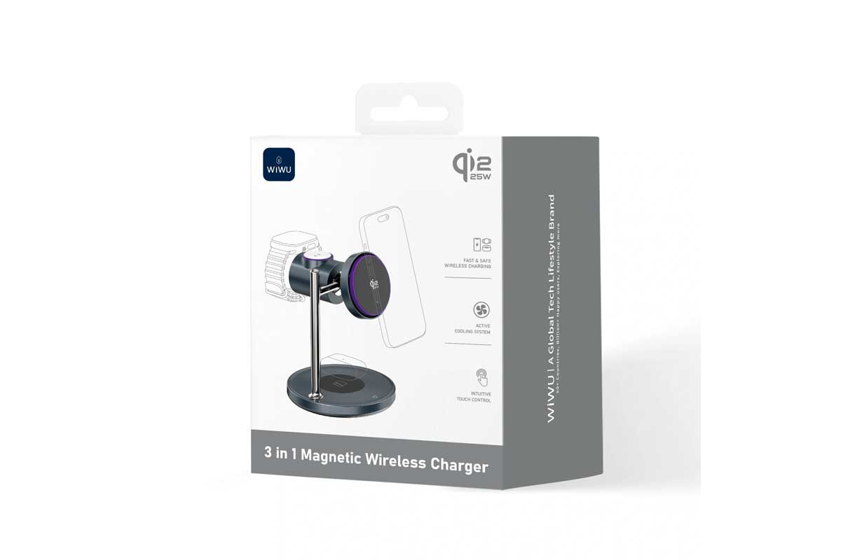 WiWU Space Station 3-in-1 Wireless Charger (Wi-W041) — стильная и функциональная беспроводная зарядная станция для экосистемы Apple. Одновременно заряжает iPhone, Apple Watch и AirPods с одного устройства, превращая рабочий стол или тумбочку в аккуратную зарядную зону. Главная особенность — магнитная подставка с сертификацией Qi2.2, обеспечивающая быструю и точную зарядку iPhone мощностью до 25 Вт. Встроенная система активного охлаждения с тихим вентилятором предотвращает перегрев и поддерживает стабильную скорость зарядки. Отдельная площадка предназначена для Apple Watch, а основание — для AirPods. Футуристичный дизайн с элементами из цинкового сплава делает устройство эффектным аксессуаром для интерьера.