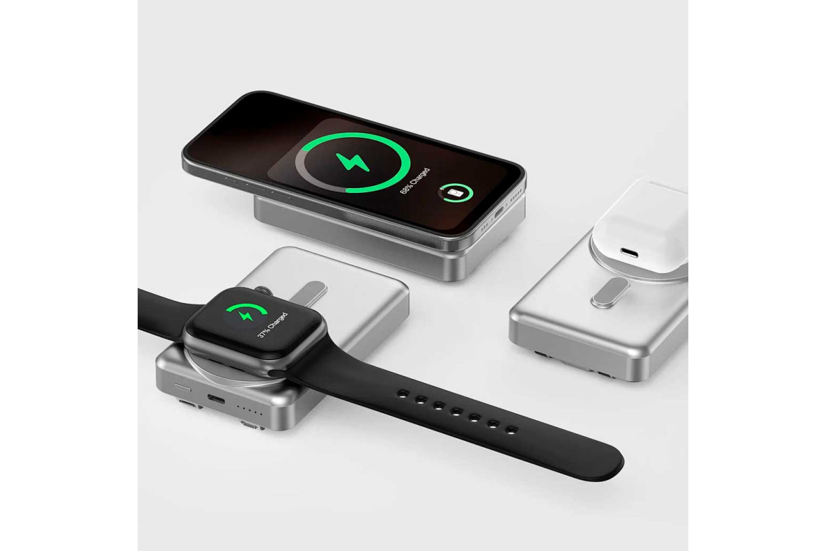 - Три способа зарядки: порт Type-C, встроенные кабели Type-C и Lightning, беспроводная площадка для телефона и часов.