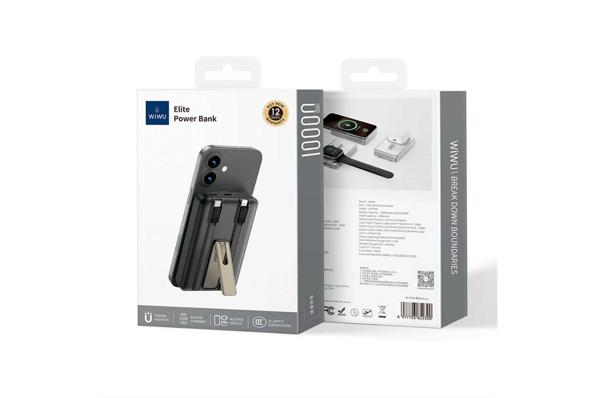 Wi-P056 — это универсальный и компактный внешний аккумулятор (Power Bank), созданный для удовлетворения всех потребностей в зарядке. Емкости аккумулятора в 10 000 мАч (38.5 Вт·ч) и номинальной емкости 6000 мАч достаточно, чтобы обеспечить надежное и длительное питание для ваших гаджетов. Устройство оснащено портом Type-C, встроенным кабелем Type-C, кабелем Lightning, а также поддерживает беспроводную зарядку. Это делает его совместимым с огромным спектром устройств: от смартфонов и наушников до умных часов. Молниеносная скорость и универсальность. Wi-P056 поддерживает быструю зарядку PD 20W и 22.5W. Порт Type-C обеспечивает выходную мощность до 20 Вт, а встроенный кабель Type-C — до 22.5 Вт. Кабель Lightning с выходом 10 Вт идеально подходит для устройств Apple. Отдельного внимания заслуживает встроенная площадка для беспроводной зарядки мощностью до 15 Вт для смартфонов и 2.5 Вт для умных часов.