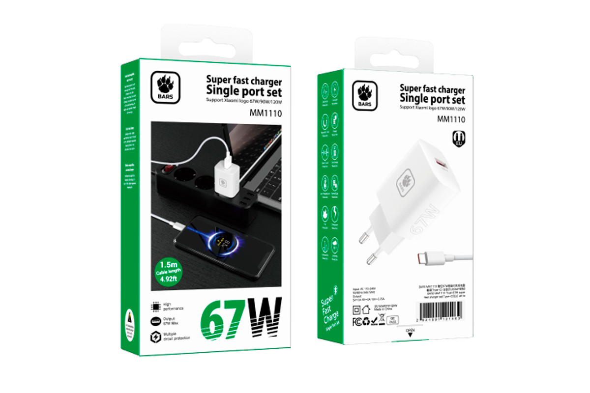 Сетевое зарядное устройство BARS MM1110 Trust 67W super fast charger set (Type-C) — это современное и высокопроизводительное решение для быстрой зарядки ваших устройств. Благодаря мощности в 67 Вт, оно позволяет заряжать смартфоны, ноутбуки и другие устройства в рекордно короткие сроки. Устройство оснащено разъемом Type-C, что делает его универсальным для широкого спектра современных гаджетов. Прочный дизайн делает его стильным дополнением к любому интерьеру. Это идеальный выбор для тех, кто ценит скорость и удобство в повседневной жизни.