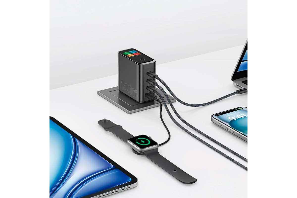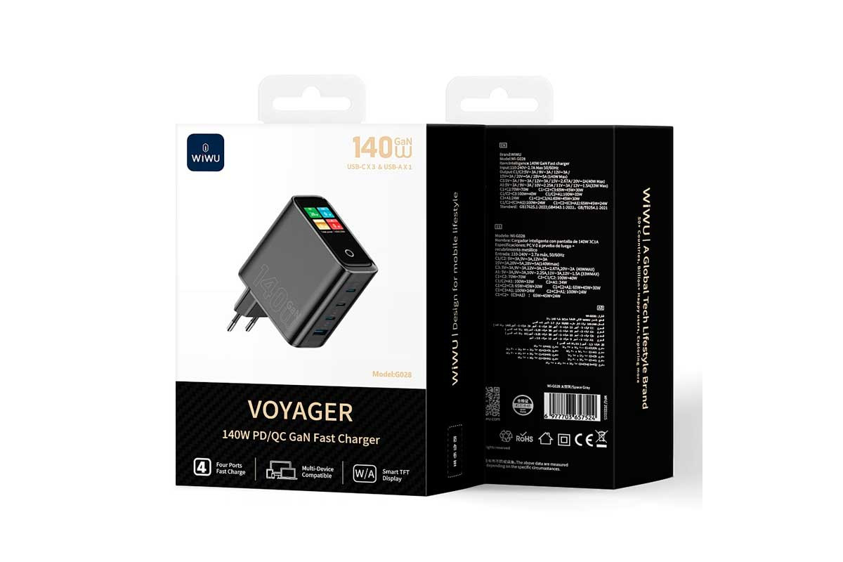 WiWU Wi-G028 — это мощный адаптер, сочетающий колоссальную максимальную мощность в 140 Вт с интеллектуальным динамическим дисплеем. Работая на передовой технологии GaN, он обеспечивает более быструю и эффективную зарядку в компактном корпусе. Инновационный экран дает вам визуальное подтверждение выходной мощности и температуры в реальном времени, чтобы вы всегда были в курсе. С тремя портами USB-C и одним USB-A он может одновременно быстро заряжать ваш ноутбук, телефон, планшет и аксессуары, устраняя беспорядок и время ожидания. Созданный для долговечности и сертифицированный по мировым стандартам безопасности, это единственное зарядное устройство, которое вам когда-либо понадобится.