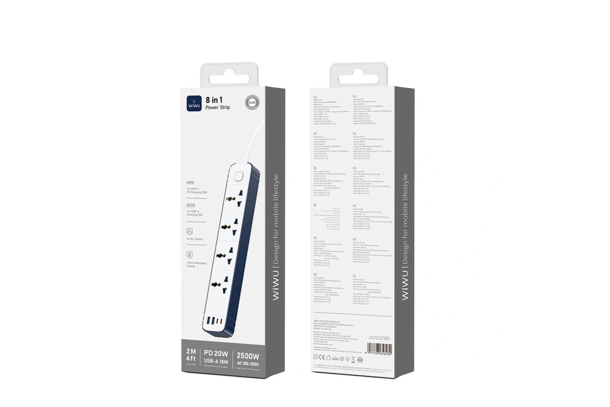 Компактный, но мощный, сетевой фильтр WiWU 8-в-1 GaN станет идеальным компаньоном на рабочем столе. Заряжайте до 8 устройств одновременно через 2 порта Type-C (PD 20 Вт), 2 порта USB-A (2,4 А) и 4 розетки переменного тока. Интеллектуальная зарядка обеспечивает оптимальную скорость для каждого подключенного устройства. Благодаря корпусу ABS+PC и полной защите от перегрузки по току, коротких замыканий и перегрузок это устройство идеально подходит как для домашнего использования, так и для путешествий.