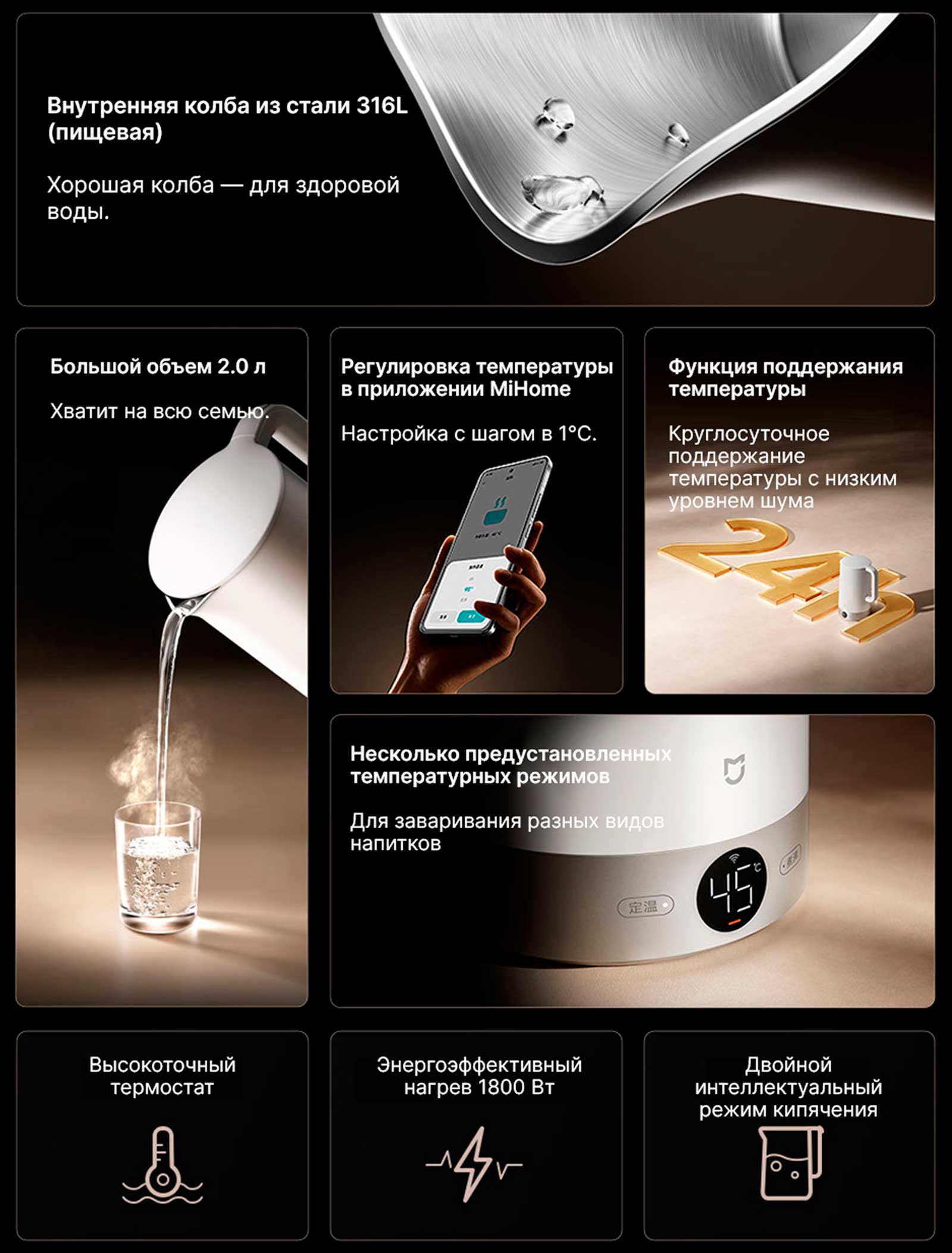 Приложение MiHome позволяет настраивать температуру нагрева от 40°С до 90°С, выбирать режимы кипячения и контролировать текущее состояние чайника в реальном времени. Вы можете сохранять пользовательские настройки для различных