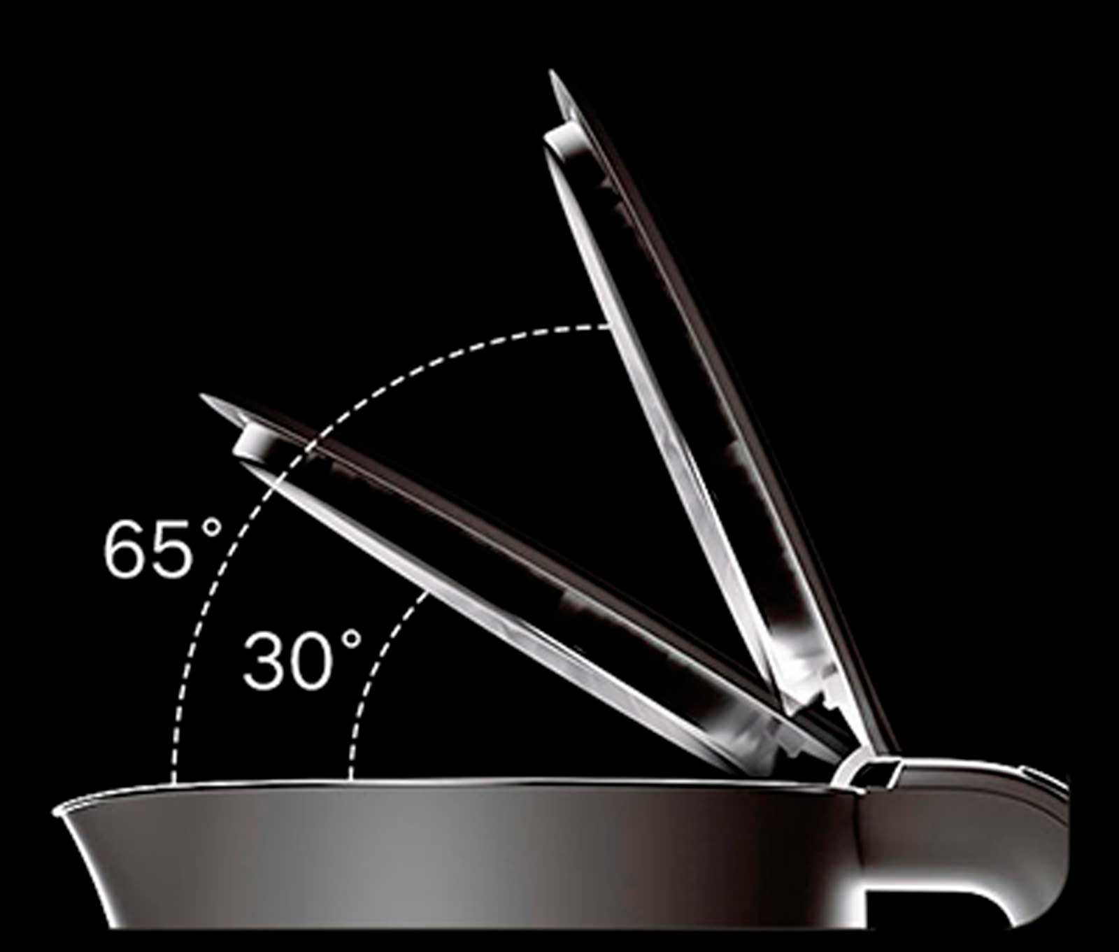Двухступенчатый механизм открывания крышки предотвращает разбрызгивание горячей воды, обеспечивая безопасность во время использования. Первая ступень открывает крышку на 30°, чтобы минимизировать риск ожогов, а вторая — на 65° для