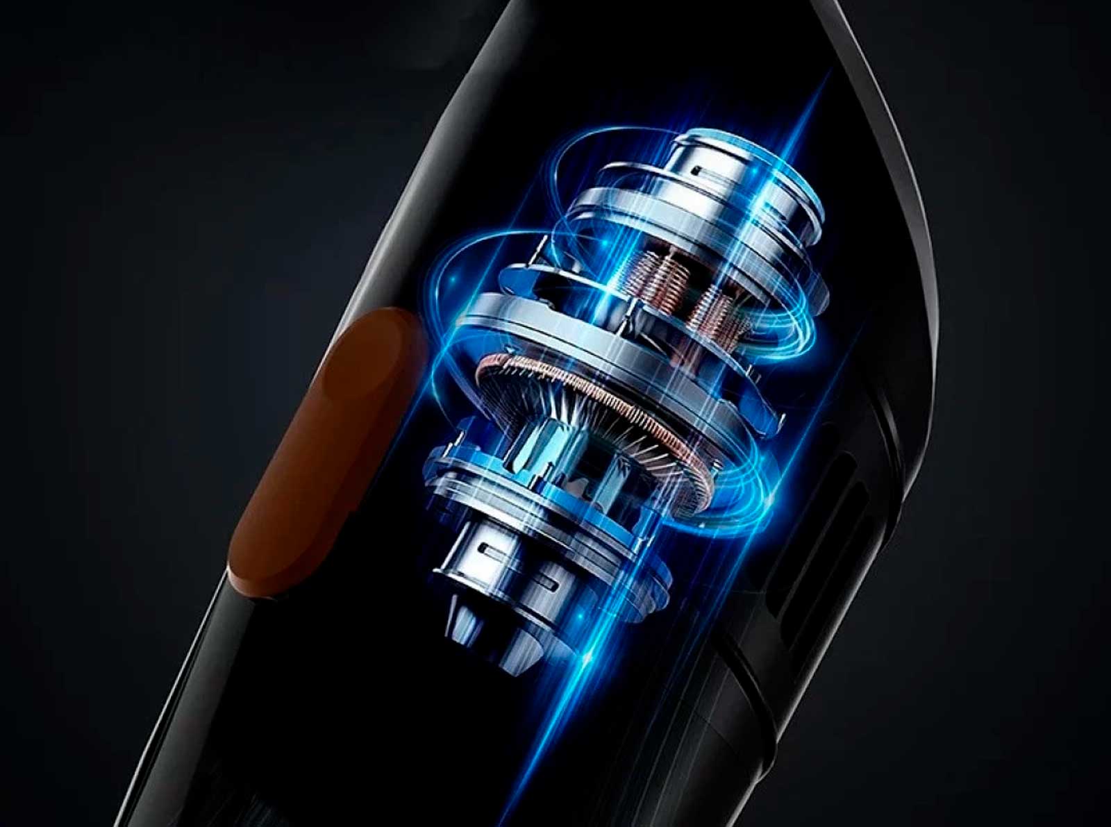 Высокопроизводительный двигатель с оптимизированной системой охлаждения работает на высоких оборотах, сохраняя заявленную мощность даже при длительной уборке. Циклонная технология создает воздушный поток с силой всасывания 15 кПа,