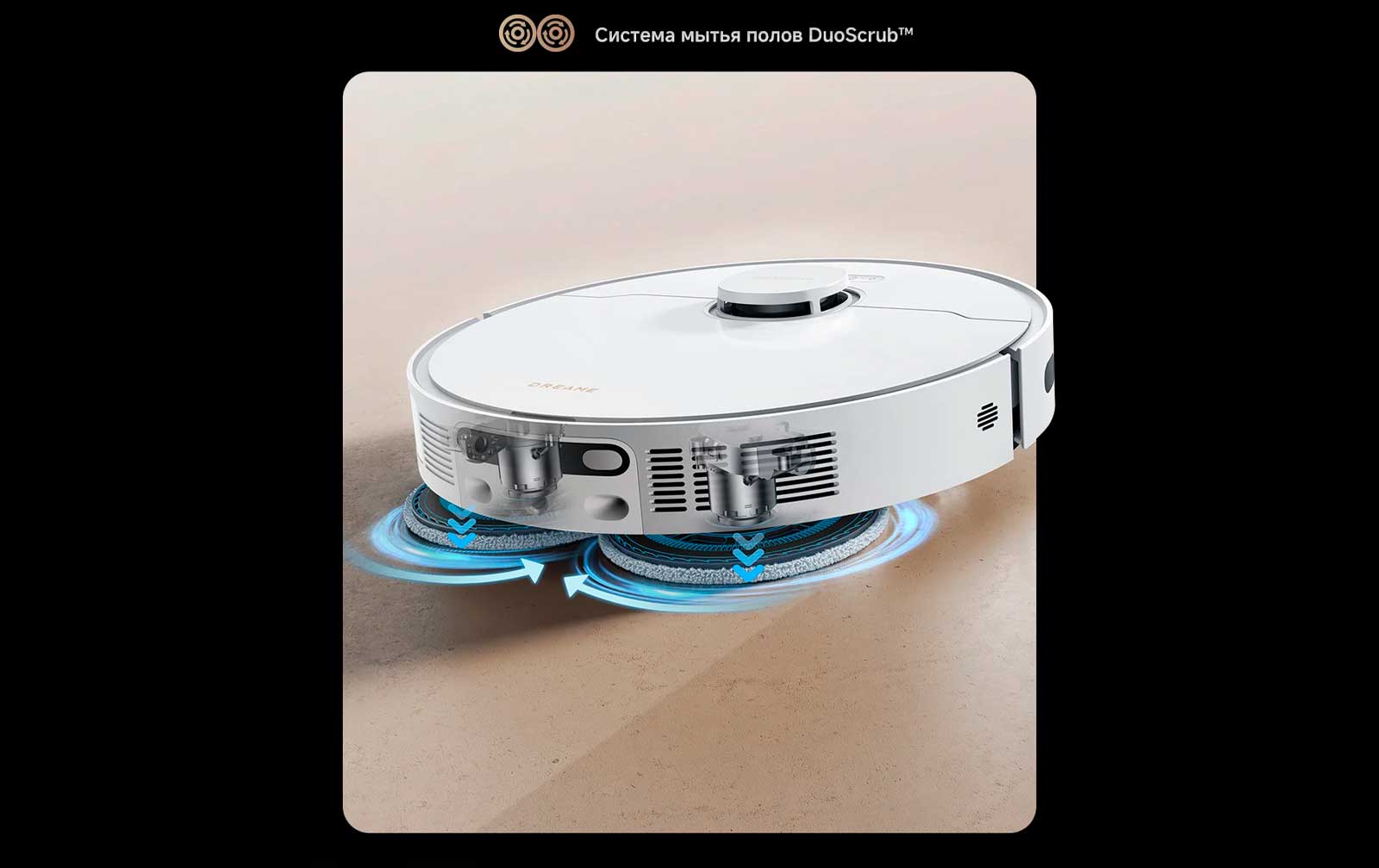 Система мытья полов DuoScrub™ оснащена двумя высокоскоростными вращающимися швабрами, которые позволяют оттирать въевшуюся грязь и пятна от пролитых жидкостей за счет прижима к поверхности пола, обеспечивая исключительную