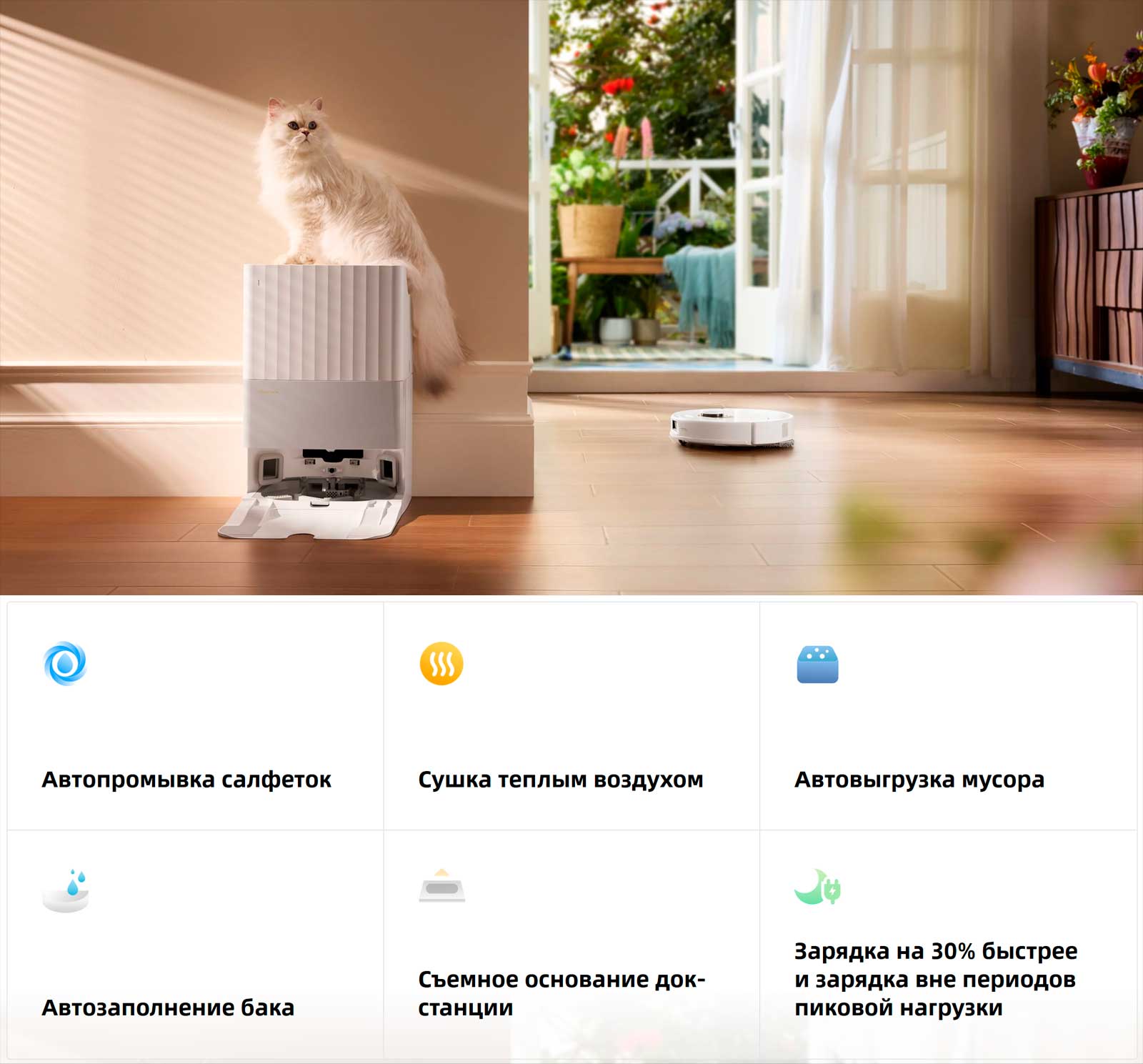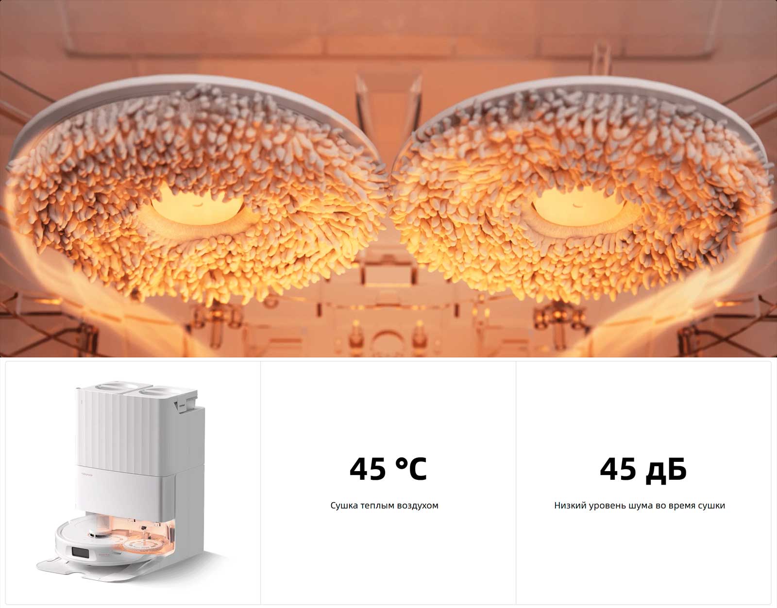 сушку при вращении на высокой скорости. Более того, док-станция динамически регулирует скорость и подачу воды, чтобы обеспечить максимальную эффективность и удобство.