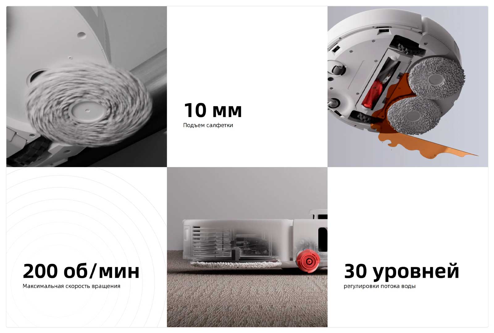 Оснащенный двумя подъемными вращающимися салфетками, робот справляется со въевшимися пятнами на твердых полах. Кроме того, при обнаружении ковров салфетки автоматически поднимаются, чтобы сохранить ковры сухими, обеспечивая