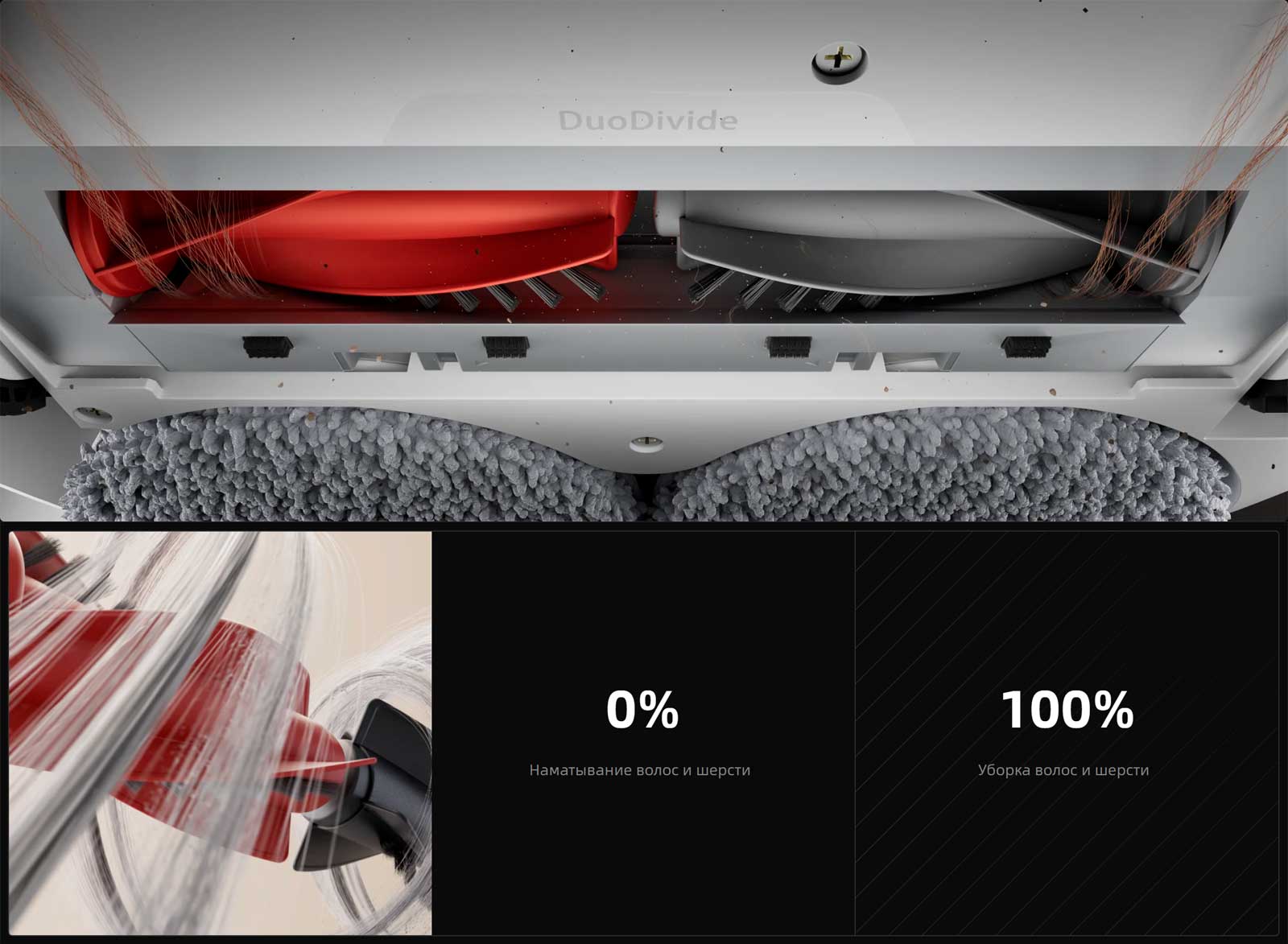 Щетка в шерсти и волосах? Не переживайте! Благодаря двум параллельным роликам с короткой щетиной и спиральным лезвиям щетка DuoDivide® легко и эффективно направляет волосы и шерсть к центру отверстия контейнера для сбора пыли. Это