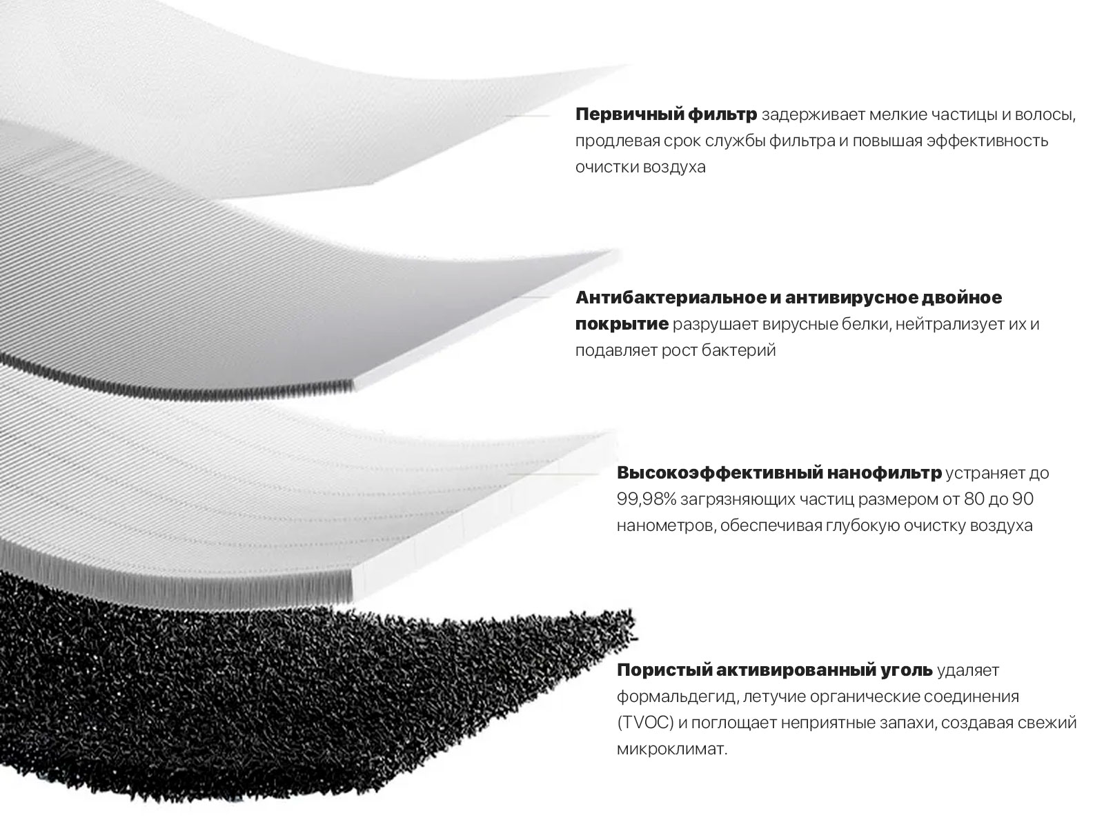 Здоровая атмосфера и беспечная забота. Система из четырёх фильтров обеспечивает глубокую очистку воздуха, создавая здоровую среду в помещении и гарантируя эффективную защиту от загрязнений.