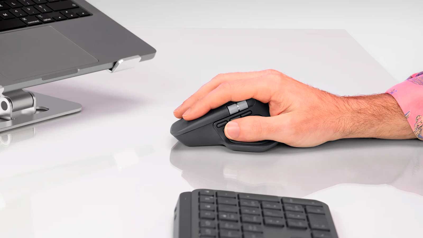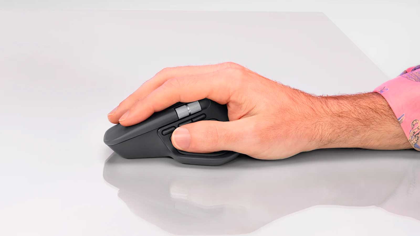 MX Master 4 создан для долгой и комфортной работы. Оптимизированный угол наклона снижает нагрузку на руки, а удобно расположенные кнопки и колесо прокрутки большого пальца обеспечивают быструю и интуитивную навигацию.