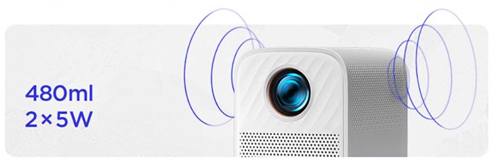 Проектор оснащён большой акустической камерой объёмом 480 мл, которая вместе с двумя динамиками мощностью по 5 Вт создаёт насыщенный и объёмный звук. Такое сочетание обеспечивает яркое звучание и глубокое погружение, идеально