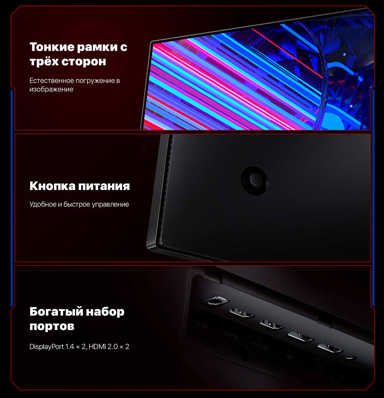 Погружайтесь в игру с естественным восприятием. Удобное управление, быстрая настройка. Поддержка DisplayPort 1.4, HDMI 2.0
