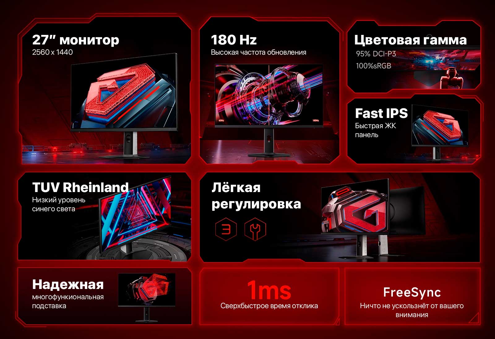 Разрешение до 2560×1440, технология Fast IPS. Сверхбыстрая ЖК-технология позволяет молниеносно реагировать на любые "неожиданные повороты событий", обеспечивая полное превосходство в решающие миллисекунды.