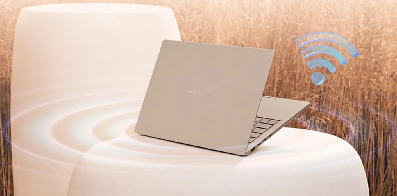 Zenbook A14 использует беспроводной модуль стандарта Wi-Fi 7, который до 4,8 раза быстрее предыдущего Wi-Fi 6. Ноутбук автоматически выбирает маршрутизатор с самым сильным сигналом и максимально эффективно использует доступную