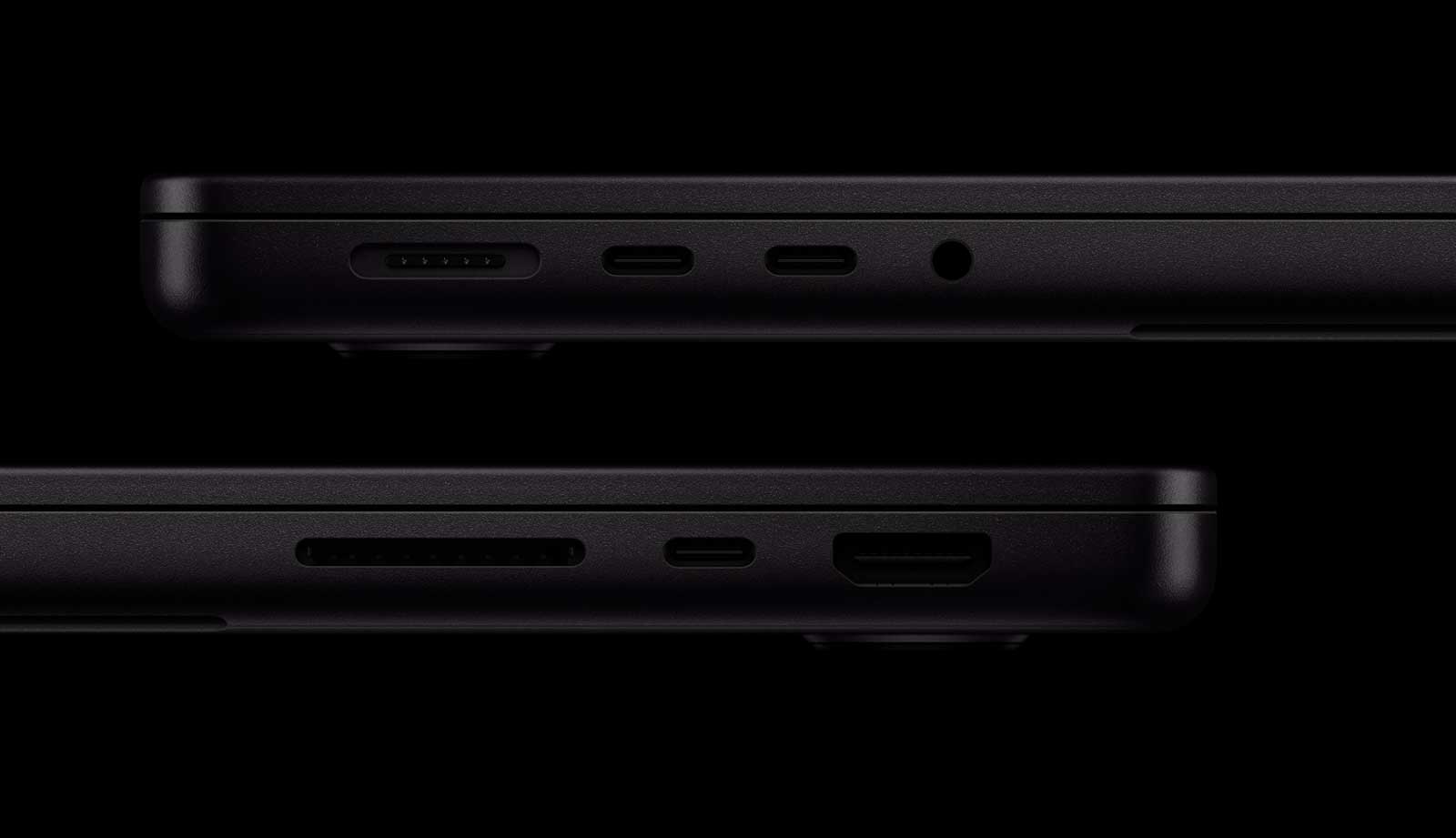 MacBook Pro оснащён множеством портов для подключения высокоскоростных периферийных устройств, работы с дисплеями с высоким разрешением или прямой разгрузки карт SDXC. Модели с чипом M5 оснащены Thunderbolt 4. Модели с M4 Pro или M4