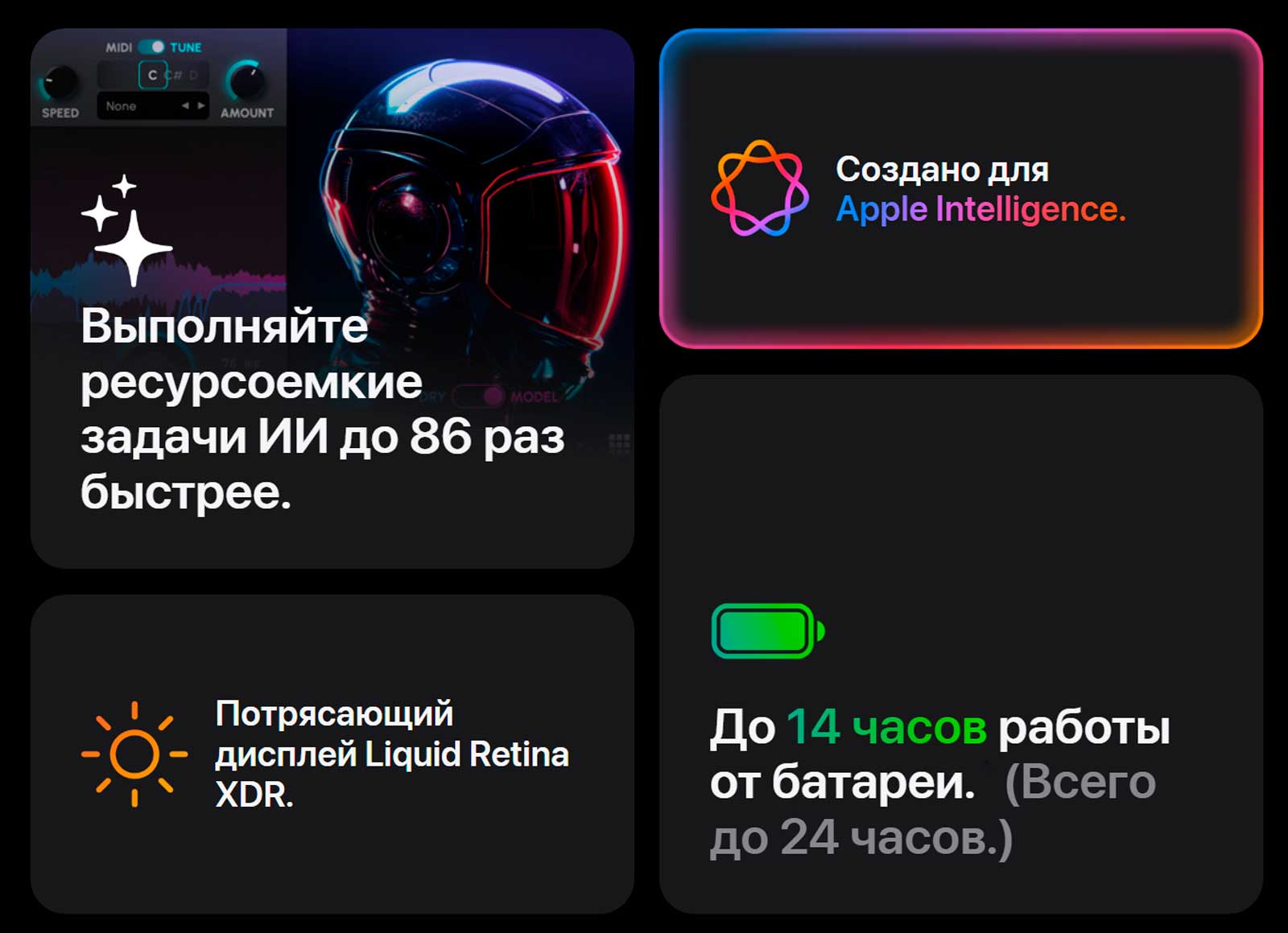 унифицированную память, что дает вам скорость, о которой вы даже не думали. А благодаря мощным нейронным ускорителям в чипе M5 вы можете выполнять задачи искусственного интеллекта с умопомрачительной скоростью.