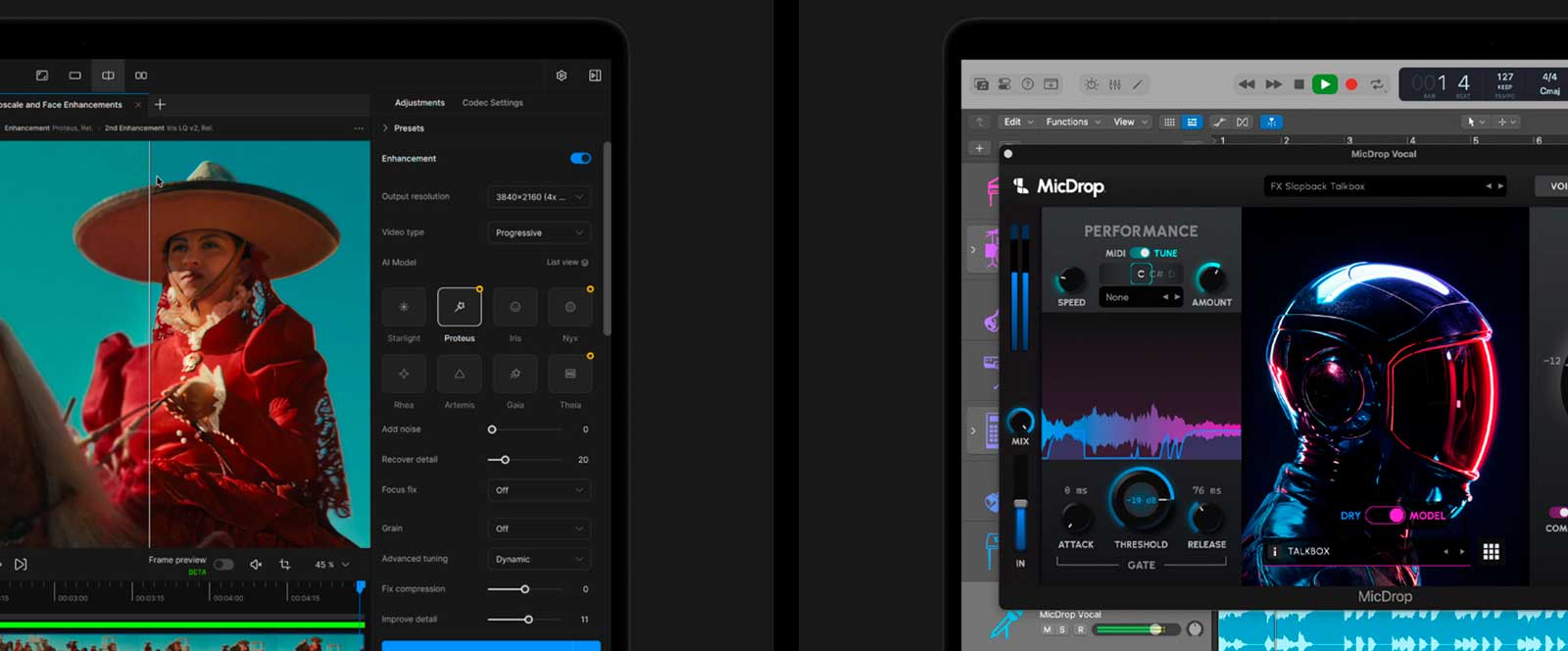 для улучшения видео, такие как Topaz Video. Преобразуйте вокал с помощью подключаемых модулей искусственного интеллекта, таких как MicDrop для Logic Pro. И вносите сложные изменения изображения за считанные секунды с помощью