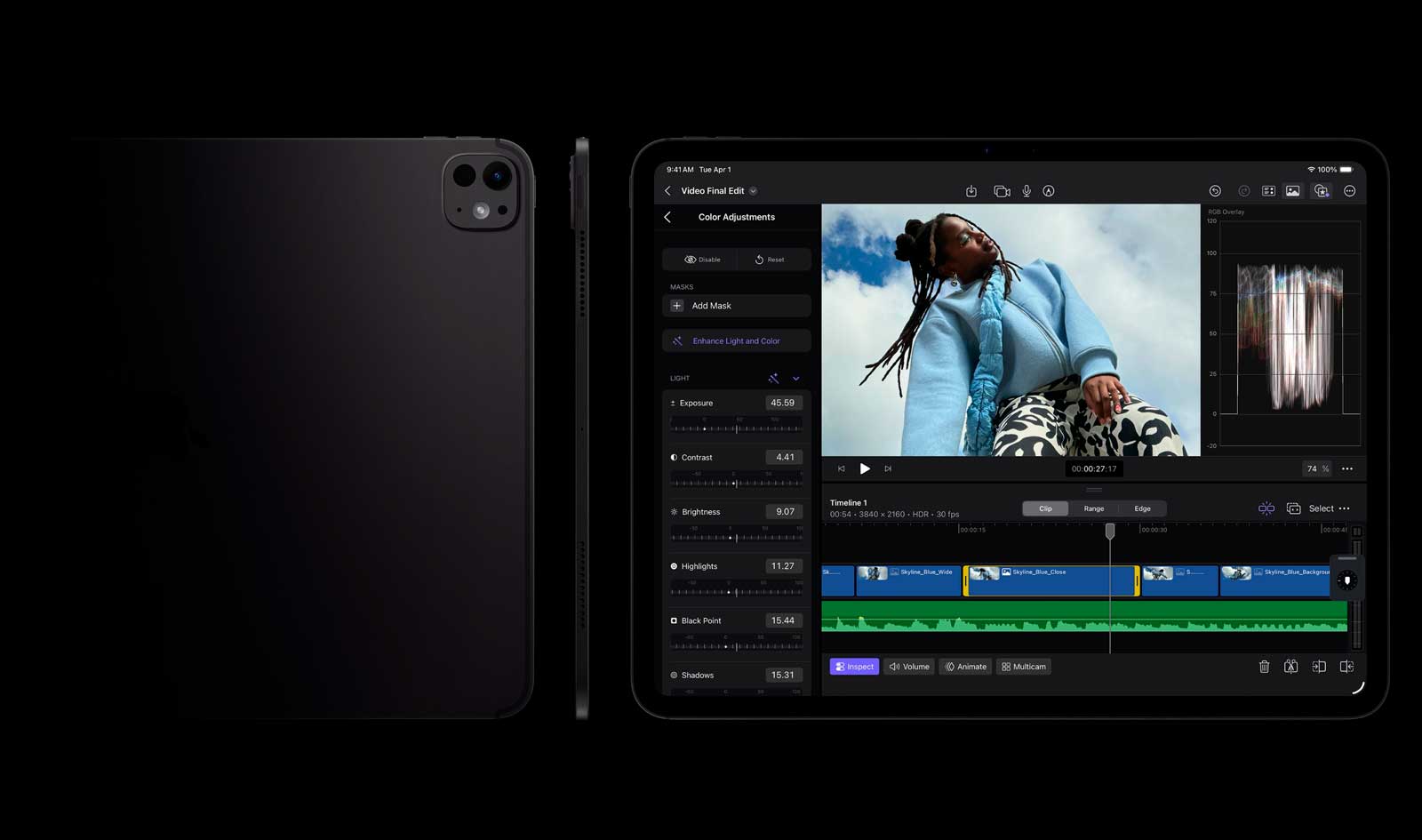 Снимайте, редактируйте и делитесь всем этим на одном устройстве с помощью профессиональной системы камер со сканером LiDAR, микрофонами студийного качества и четырьмя динамиками. Записывайте видео в формате 4K ProRes, записывайте