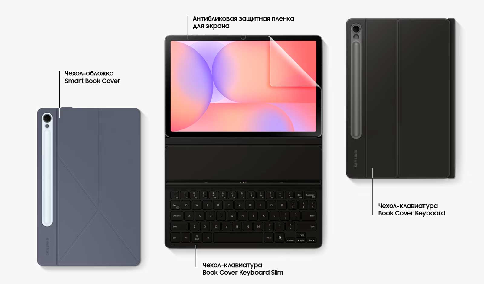 Galaxy Tab S10 Lite отлично работает с различными аксессуарами для планшетов, включая чехол-клавиатуру Book Cover Keyboard, чехол-клавиатуру Book Cover Keyboard Slim, чехол-накладку Smart Book Cover и антибликовую защитную пленку.