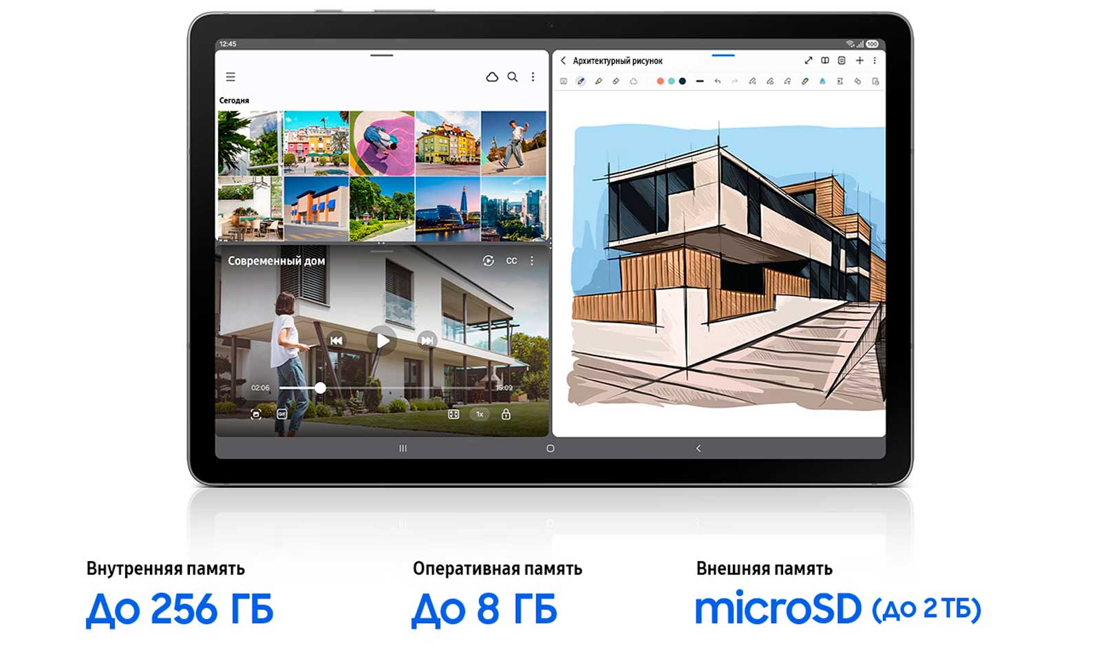 память может быть увеличена дополнительно до 2 ТБ с помощью карты microSD. На этом планшете легко фиксировать идеи с помощью пера и работать эффективно — доступное пространство и скорость работы позволяют не прерывать творческий